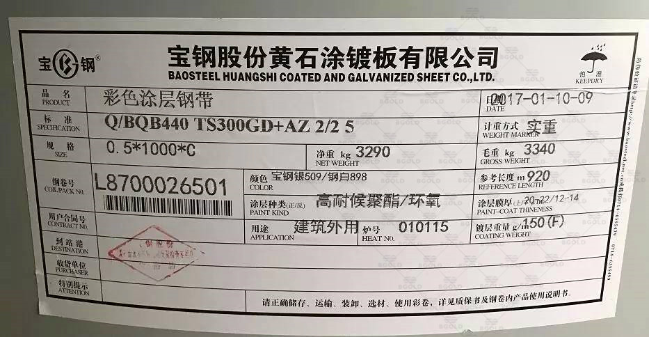 上海寶鋼彩鋼板標(biāo)簽全稱為:寶山鋼鐵股份有限公司,標(biāo)簽右側(cè)有總部二字。