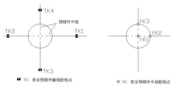 在設計圖紙上根據(jù)各預埋件的結構中線確定YK1、YK2、YK3的位置,獲得其坐標值,在預埋件上做出YK1、YK2、YK3的標志。用全站儀極坐標法線定位YK1點,確定預埋件的中點位置,再用同樣的方法測定YK2、YK3的位置,控制預埋件的軸線方向。